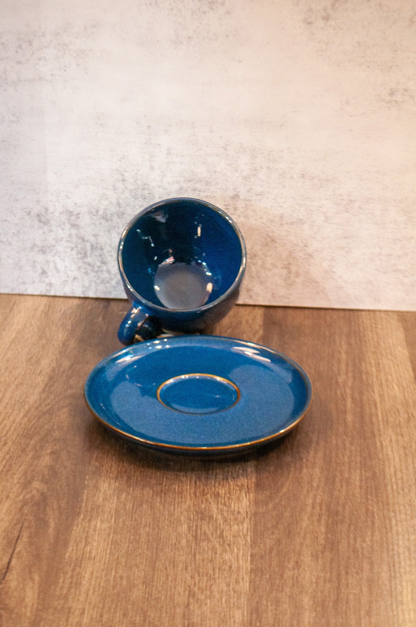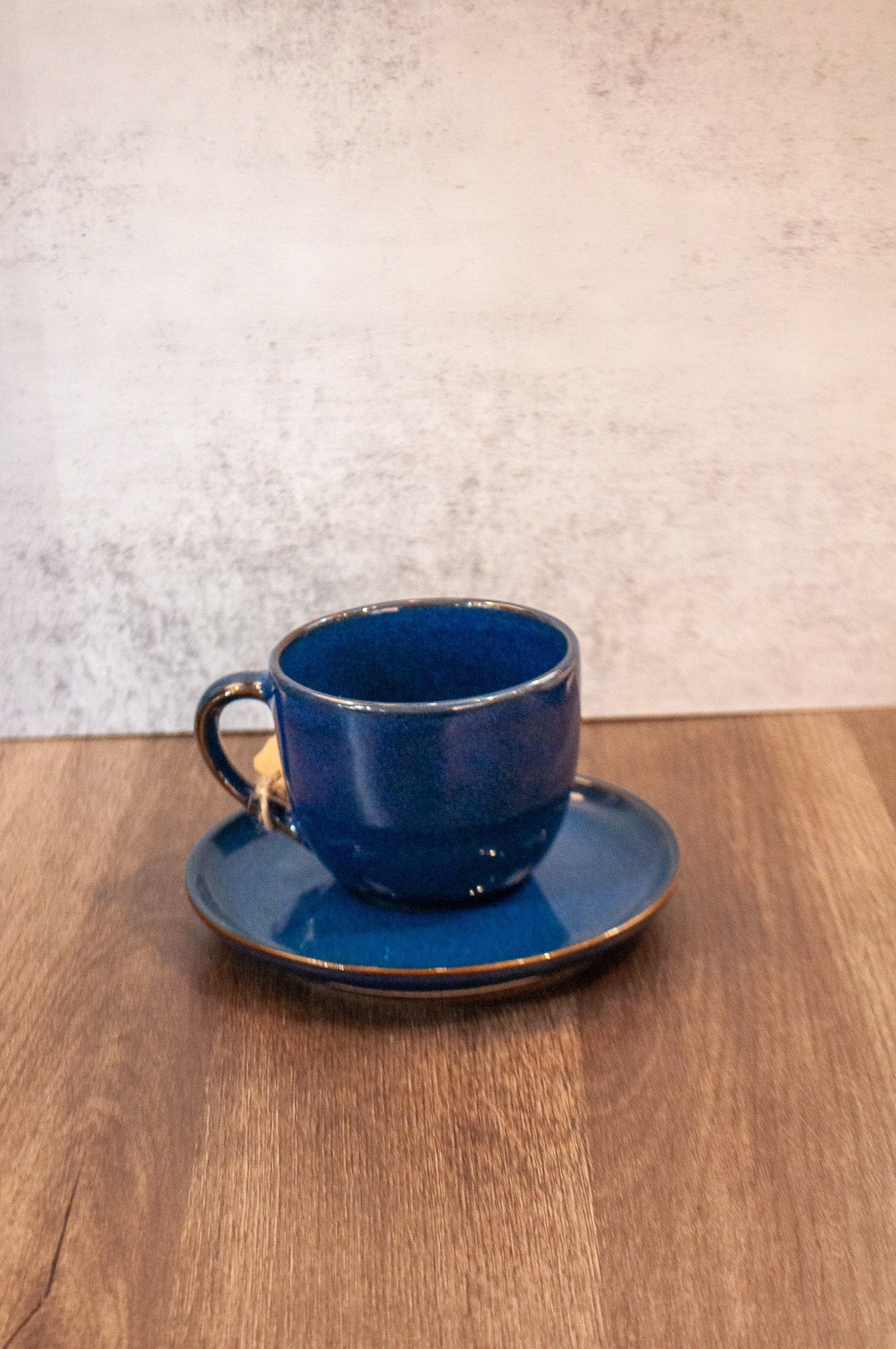 The accompanying saucer provides the perfect resting place, catching drips and providing space for a biscuit or sugar cube. A subtle, natural earthenware brown rim delicately outlines both the cup and the espresso cup and saucer plate, providing a beautiful, contrasting highlight that emphasizes its hand-glazed, rustic dinnerware appeal.