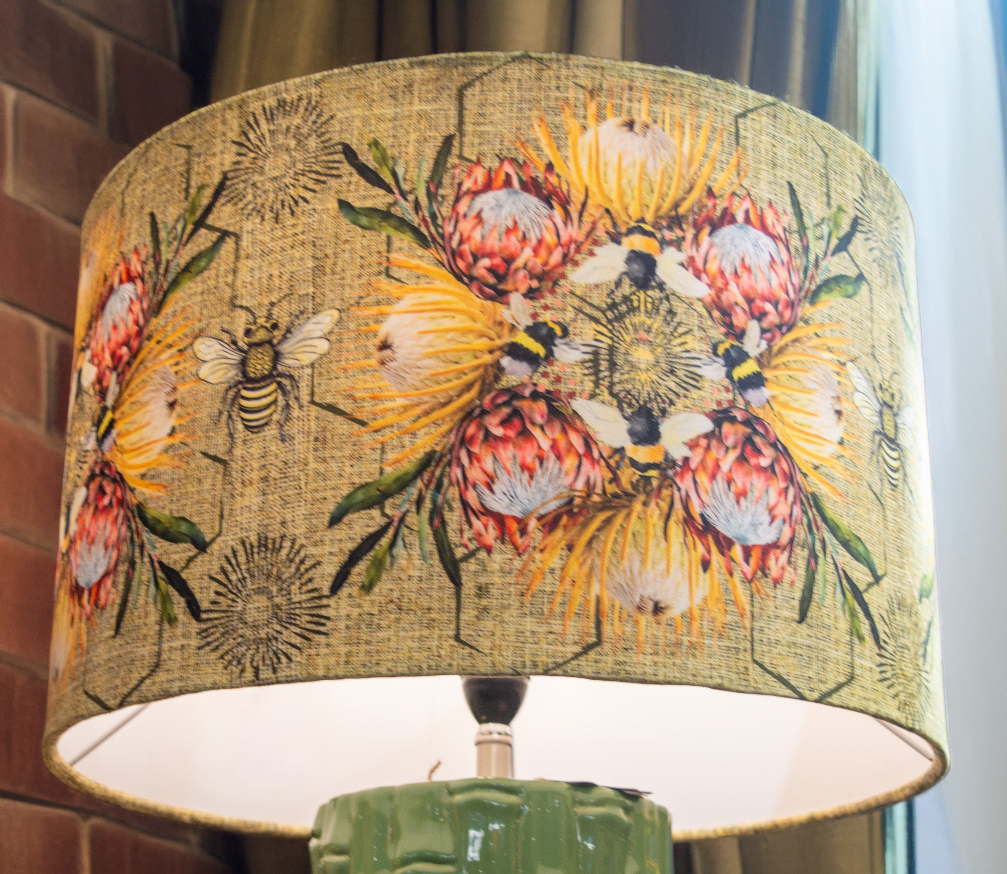 Add a bold touch of African decor to your space with this handcrafted lampshade, featuring a vibrant King Protea and bee pattern inspired by South Africa’s fynbos. Set against a warm khaki green background, the rich botanical design brings color, nature, and texture to any room. Perfect for living areas, bedrooms, or entryways.