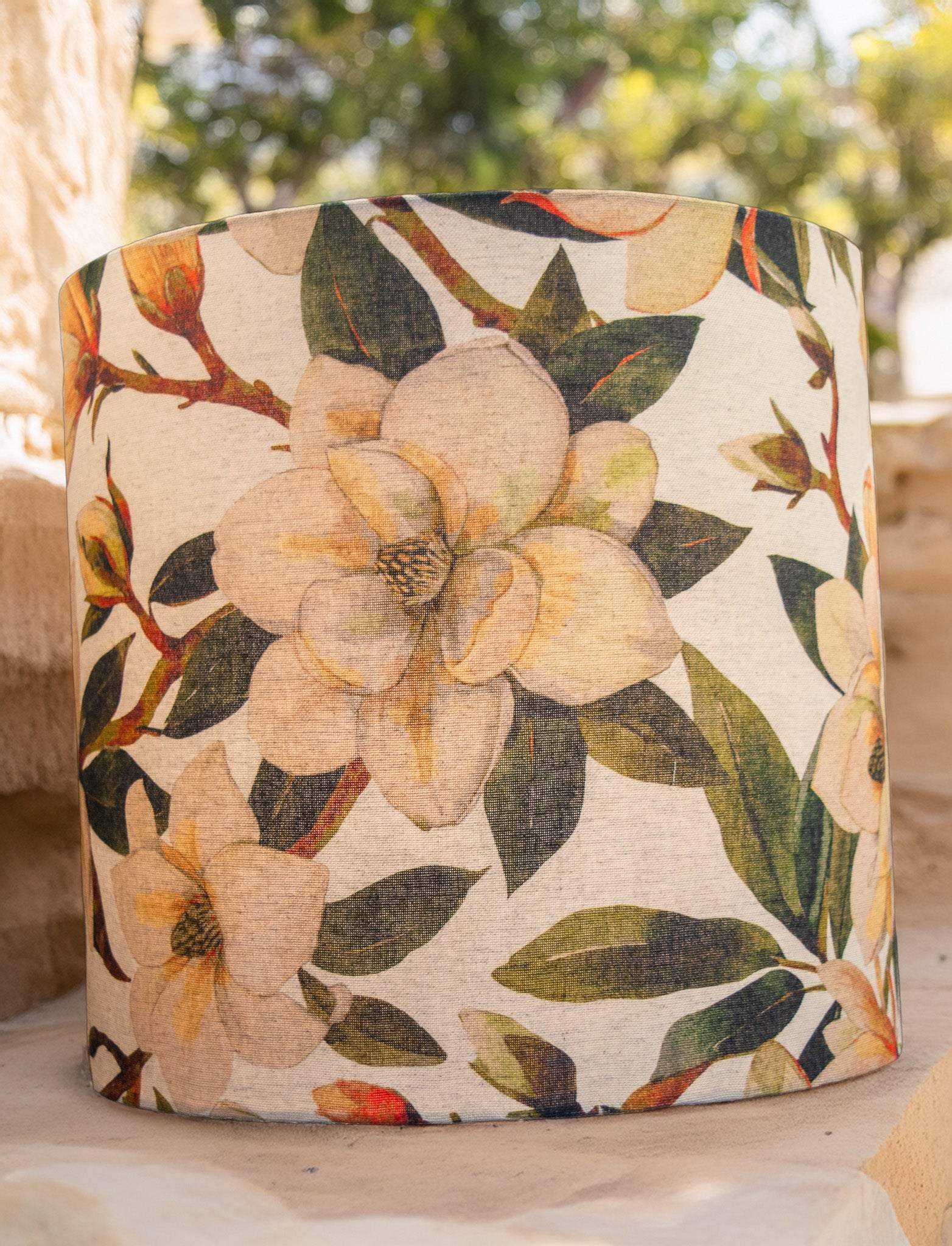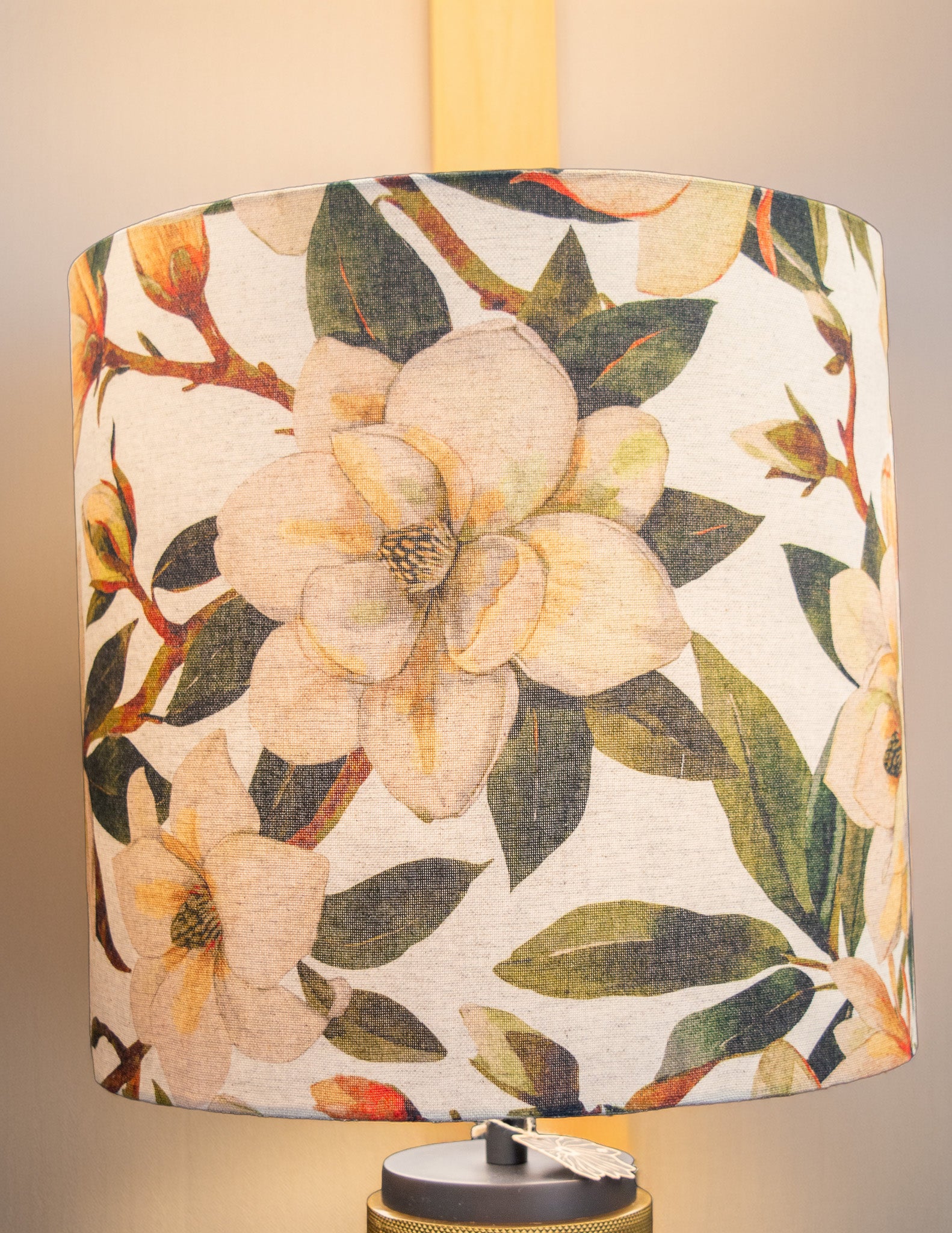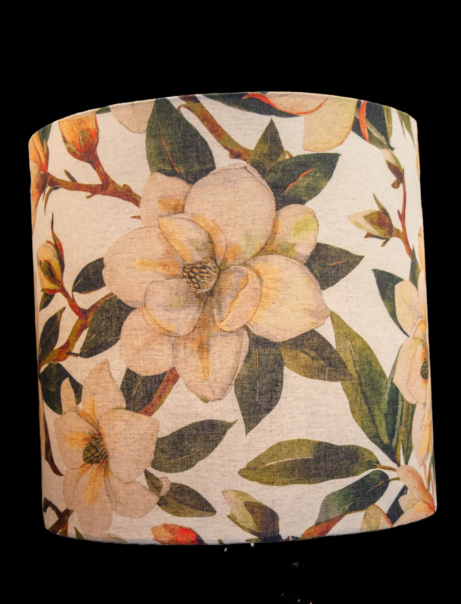 Elevate your interior lighting with this exquisite botanical print drum lampshade. The hand-rolled design features a lush, artistic pattern of large, creamy white magnolia flowers set against rich, variegated green leaves. The fabric has a beautiful natural, linen-look texture, giving the piece a high-end, vintage feel.